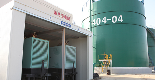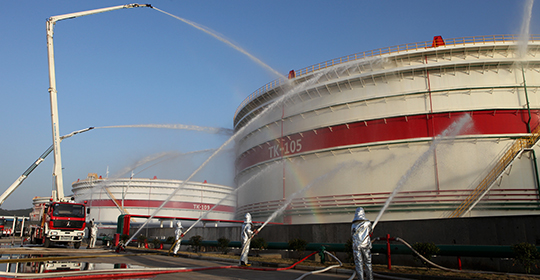 本库区占地约1400亩,所占区域(约2500亩)范围是围海造地,用已建成大堤和新建大堤围住。新大堤上设有闸门。如有泄露可通过闸门控制,确保油品不泄入大海。库区消防通道宽度全部为9米,转弯半径为12米,并有两个大型停车场,便于消防车的集合和展开作业。中央控制室、消控楼均建在相对高于罐区、泊位等作业区,处于上风向。建有消防海水泵站1座和海水管道1根(DN400)。库区配备1辆32米举高喷射消防车,3辆15吨重型泡沫水炮两用车,并配有专业的消防队伍。并建有35千伏和10千伏两路供电设备,并配置2台400KW移动式应急发电车。采用消防控制中心集中报警和集中联动方式。为防范雷电多发采取了先进的处理检测系统:在大型外浮顶油管一次、二次密封腔内安装8台可燃气体检测器以及若干氮气喷嘴,主动检测可燃气体浓度,必要时采用氮气稀释,用氮气灭火速度最快。库区内建有50吨/小时的污水处理厂和2.5万立方米容量的应急池。